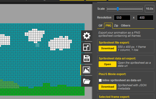 Draw a simple background and click on Export image button on the right and click on the PNG tab then Spritesheet file explort > Download. Move the size slide to be x10 so the image will be 550 by 400 wide.